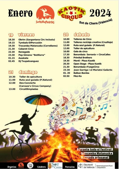El festival Hogueras & Kaotik Circus es un maravilloso encuentro anual que combina música, circo y actividades que promueven la vida rural. Organizado por la Comisión de Sote Hogueras y la Asociación Valenciana de Circo, el evento se ha consolidado como uno de los principales festivales de invierno en la Comunidad Valenciana. Es un festival sin ánimo de lucro, donde la comisión de Hogueras Sote y la Asociación Valenciana de circo trabajan de forma voluntaria para crear un festival diverso, gratuito y callejero.